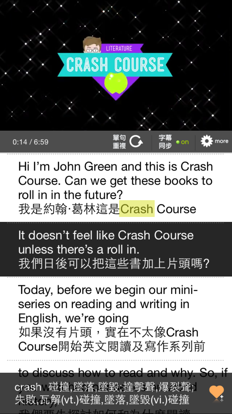5. 超方便的「查單字」,只要長按單字,就會顯現出單字意思囉! 點擊「personal」,還有超棒的功能可以使用,像是單一影片重覆及中英文字幕切換。